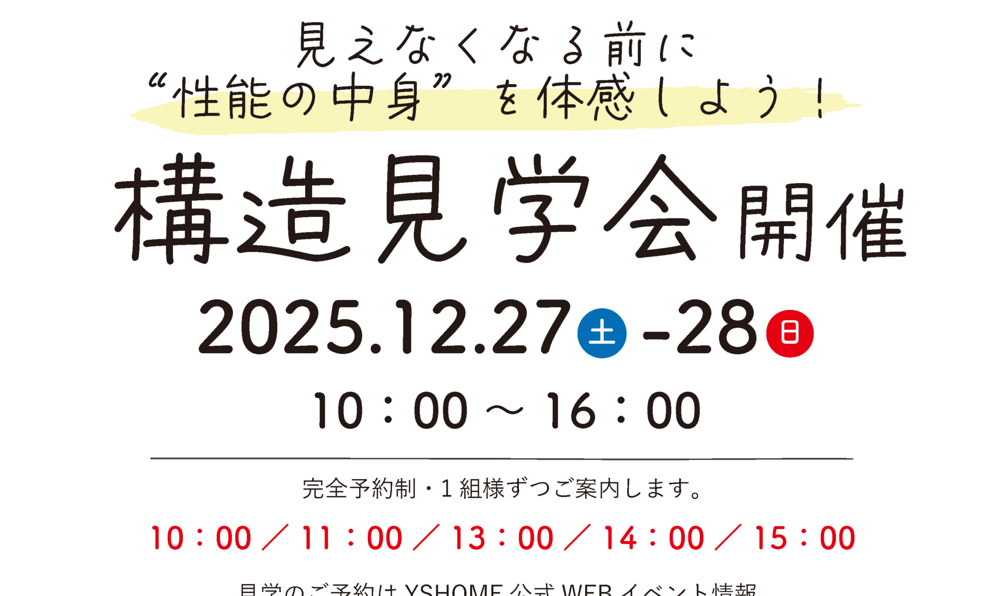 こちらの受付は終了いたしました。2026年3月頃に完成見学会を開催予定です。詳細が決まり次第、YSHOME公式WEBページNEWSにて公開いたしますのでぜひお気軽にご参加ください。 完成後には隠れてしまう「家の性能」を実 … 続きを読む 【受付は終了しました】≪構造見学会開催≫「播磨の家」12月27日・28日限定公開 ~見えなくなる前に、“性能の中身”を体感しよう!~
