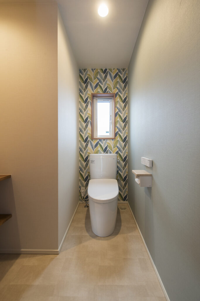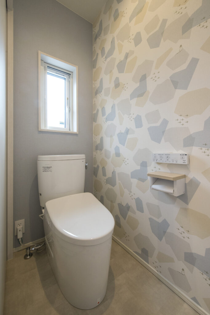 トイレなどのプライベート空間には、施主様のセンスが光る遊び心のある壁紙(アクセントクロス)を採用しました。